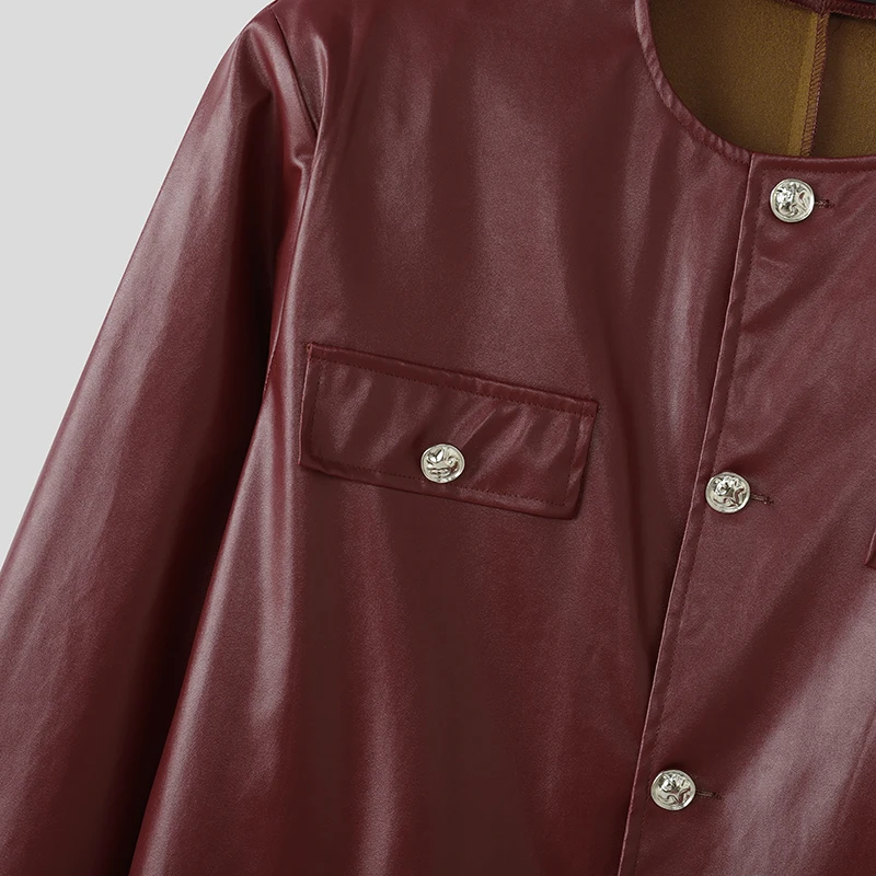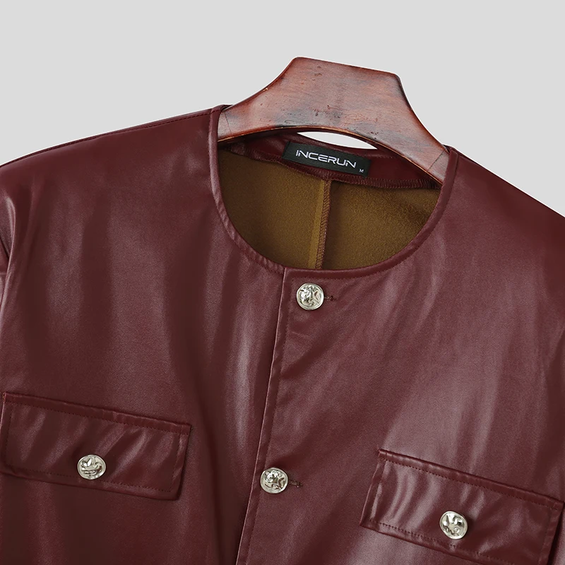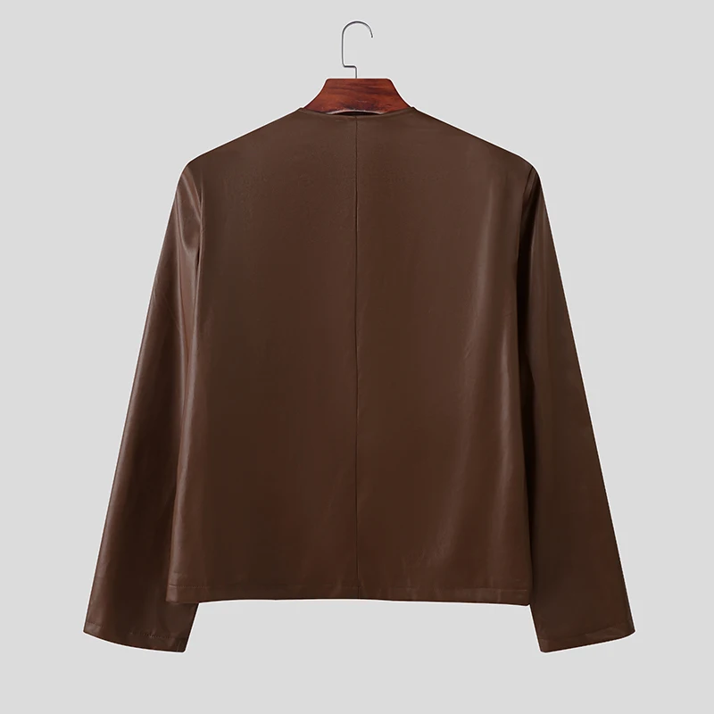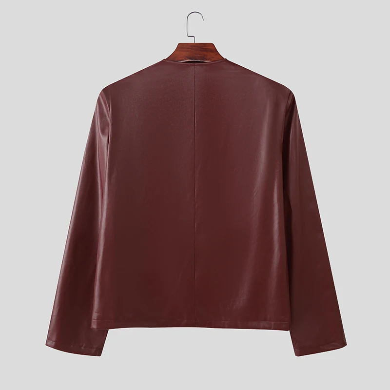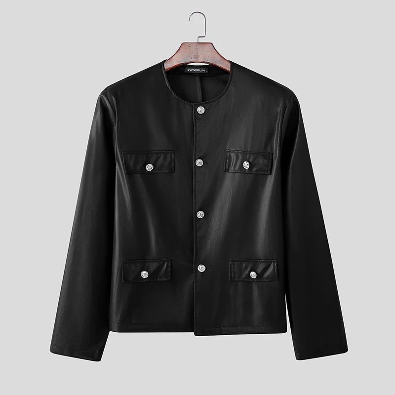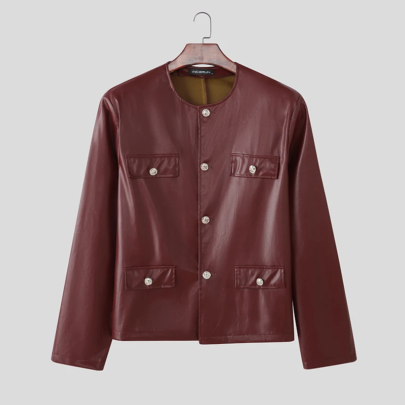 INCERUN Men Jackets PU Leather Solid Color O-neck Long Sleeve Male Coats Streetwear Button 2025 Fashion Casual Jackets Outerwear