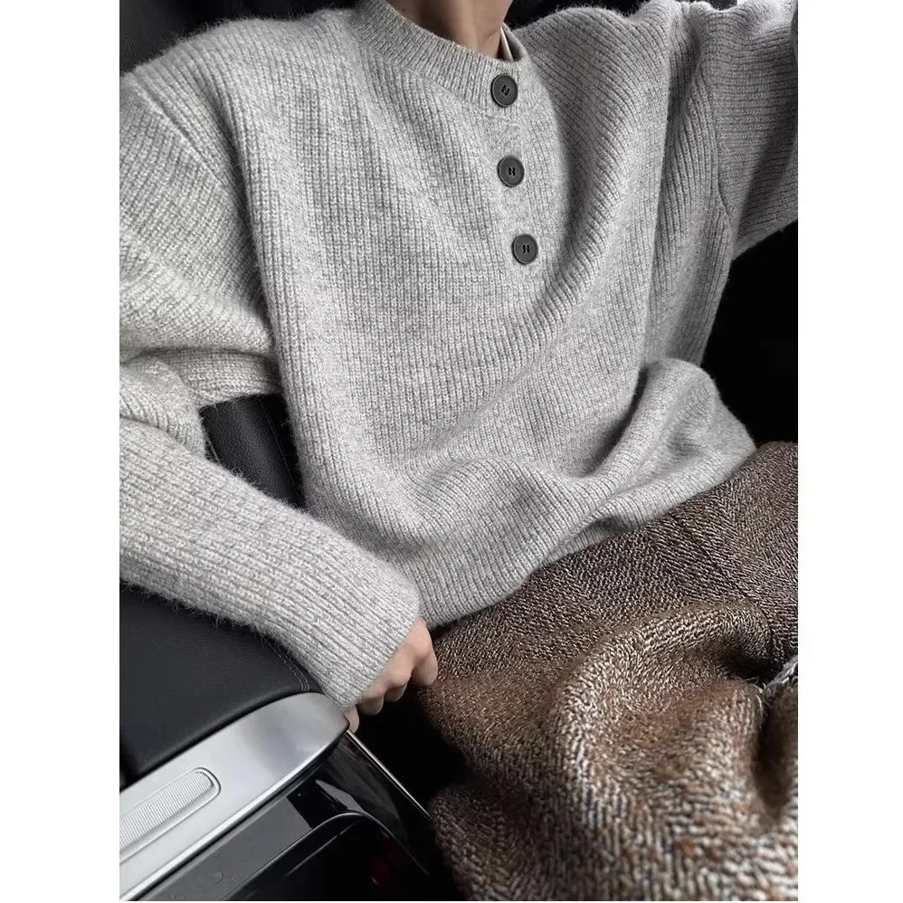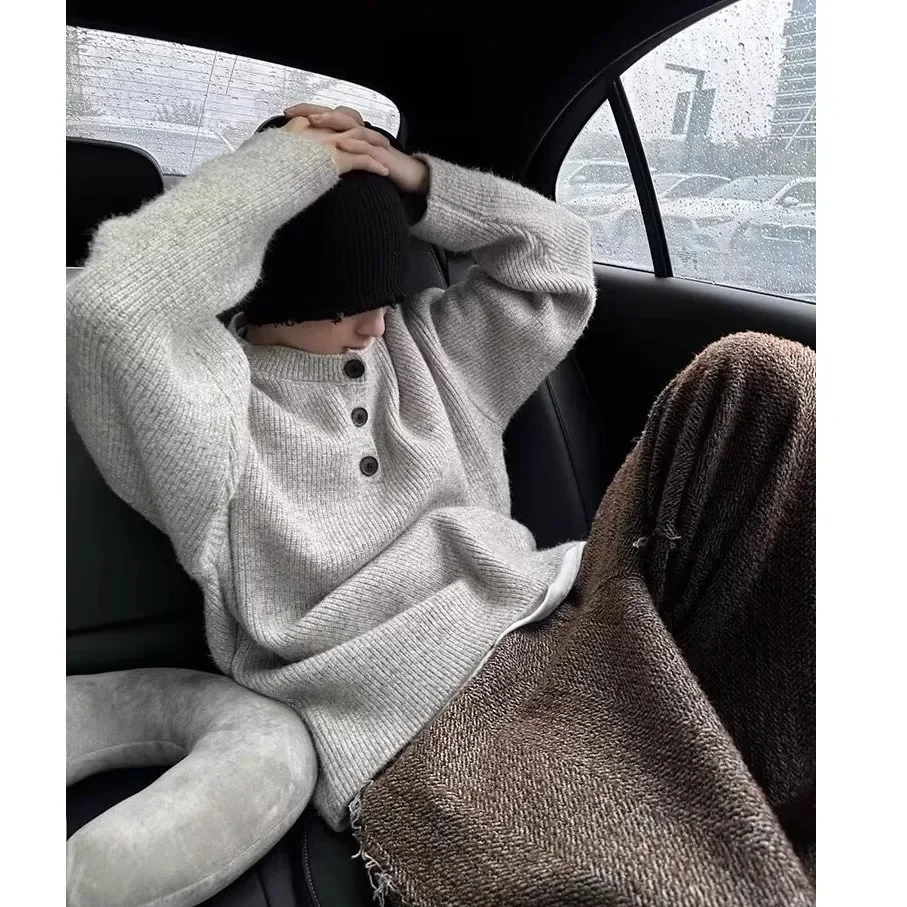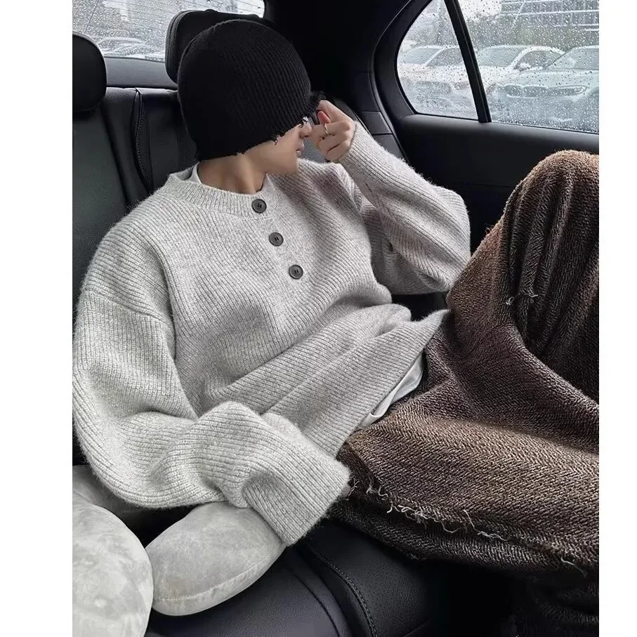 Men's Fashion Lazy Style Knitted Sweater Single Button Loose Henry Collar Winter Casual Outerwear Comfortable Soft Cotton